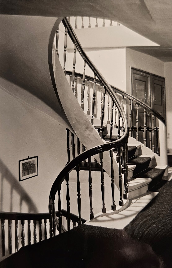 Das großzügige Treppenhaus mit Balustrade (Geländer) an drei Seiten und einer Holzwendeltreppe über drei Etagen wird durch ein aus zierlichen Traljen (Gitterstäben) bestehendes Geländer geprägt. Es diente neben der Warenbewirtschaftung als repräsentativer Empfangsraum. Heute befinden sich dort noch alte Apothekengeräte, wie ein eiserner Mörser aus dem 17. Jahrhundert, eine alte Eisenpresse und eine vorindustrielle Tablettenpresse. Dieses unter Denkmalschutz stehende Kaufmannstreppenhaus (Bild vor dem Umbau 1984 rechts) gilt als typisches Beispiel für eine Diele in einem mittelalterlichen Gildehaus, und weckt der Autorin Else Alpers zufolge Buddenbrooksche Reminiszenzen („Buddenbrooks: Verfall einer Familie“ (1901) von Thomas Mann. Er erzählt vom allmählichen Niedergang einer wohlhabenden Kaufmannsfamilie und illustriert die gesellschaftliche Rolle und Selbstwahrnehmung des hanseatischen Großbürgertums zwischen 1835 und 1877. Thomas Mann erhielt 1929 für Buddenbrooks den Nobelpreis für Literatur.). Während das Haus bis 1978 noch als Wohnhaus des jeweiligen Apothekeninhabers genutzt wurde, dient es nach der Renovierung seit 1984 als Ärzte- und Apothekenhaus (Bild des Treppenhauses und der Diele nach dem Umbau 1984 links).